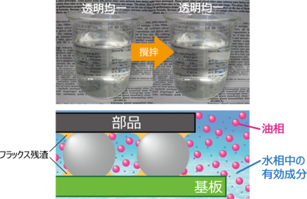 化研科技传统的低VOC清洗剂,是利用油相和水相分离的成分有效地对助焊剂残渣进行清洗。新开发的MICROCLEAN ECO-8100U是将油相微化到纳米尺寸,对传统清洗剂不能清洗的狭窄间隙内的助焊剂残渣有强力清洁能力。