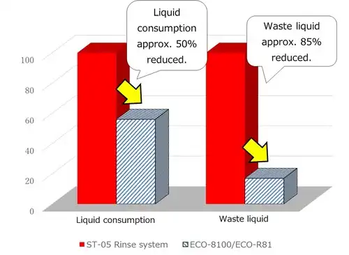 ECO-8100U/ECO-R81U含水量约为70%,保持了与传统漂洗系统ST-05U相同的清洗品质的同时,可将因挥发或烘干引起的VOC总排放量减少约一半。