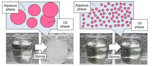 高亲和性的一方相(通常是油相)通过覆盖颗粒表面来扩散,从而减弱被清洗物表面与颗粒之间的相互作用和物理粘附。另一方的相(通常是水相)则被推测具有将含有颗粒的油相从被清洗物表面剥离并分散的作用。