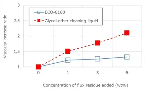 图 10 ECO-8100U与传统乙二醇醚类清洗剂在混入助焊剂残渣时的粘度上升倍率比较图