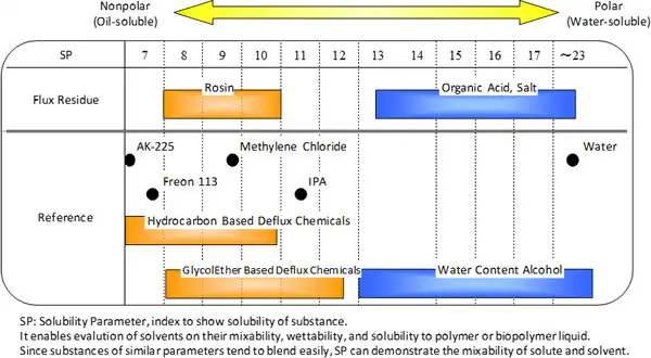 • 2.对于助焊剂残渣中各类极性和溶解度参数(SP值)差异大的复合成分具有广泛溶解性(图2.2)。
