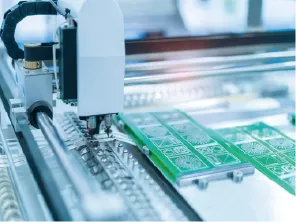 这一过程中会使用到一种叫做贴片机的设备。在贴片机内,吸嘴吸附电子元件,这些元件通常存放在胶带卷或托盘上,并将它们精确地安装在印刷电路板的适当位置上。