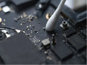 波峰焊的插入封装元件大多对清洗剂没有耐性,大部分情况下我们只对印刷电路板的背面(焊接部分)进行手工清洗。考虑到现场人员的负担(如气味和健康问题等),当使用棉棒或刷子进行清洗作业的时候,有必要选择不容易脱落碎线头和刷毛的款式。